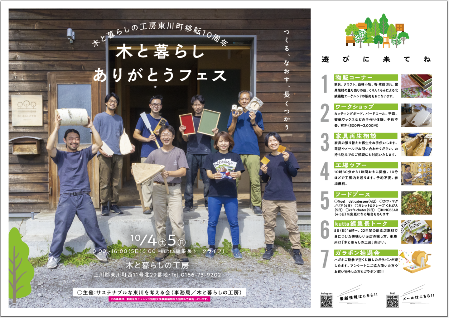 清々しい秋晴れの中、ありがとうフェス開幕です。 フードコート、二日間よろしくお願いしま〜す。 二日間通して人気の、季節も野菜とチキンカレー「KING BEAR」さん 東川、農家の小さなお惣菜店「Noel」さんのキッシュとスープ 旭川市旭神の「カフェ・マグノリア」さん 2日目の出店は、神楽岡のガレット専門店「creperieくれぴえ」さん カッティングボードワークショップ。S・M・L から選んで、、、 型を選んでも、フリーハンドでご自由にでも! 職人さんの指導のもと、電動糸鋸に初挑戦! ペーパーで角を落として、天然油で仕上げます。 森の恵みキャンドル「Lampo ランプ」さんの蜜蝋キャンドルワークショップ 湯煎して溶かした蜜蝋を形に流してゆく 白樺の枝を切ってキャンドルスタンド。ドリルで穴あけ 工場の中はオープンからお客さんでいっぱいに スウェーデンの老舗テキスタイルブランド「Ekelund」エーケルンドも好評でした。 白樺の樹皮や端材を生かした小物たち。 木と暮らしの工房の、OG(yumeちゃん)/OBたちの作品も。 工場見学。「再生可能な」「持続可能な」を目指してます。 普段見ることができない工場内も。両側は「白樺」の製材 白樺の家具ができるまで。造林・製材から製品までと、森の保全のお話 「つくる」だけでなく、「なおす(家具の再生)」も創業時から。 Yチェアの再生。木部のメンテとペーパーコードの張替えも。 2日目の15:08分!ガラポン抽選会の一等賞!HOスツールおめでとうございます! ななかまど「ミニぐるめ君」&「Kutta編集長」尾崎さんの大事な「食」のおはなし。いつお聞きしてもためになって面白いですね