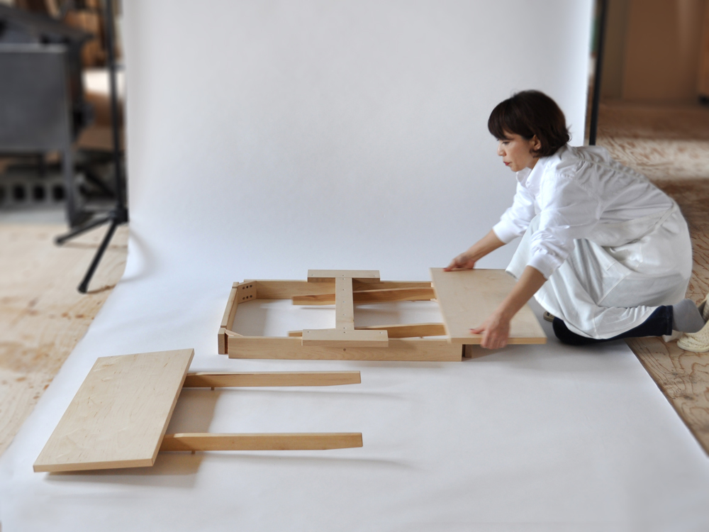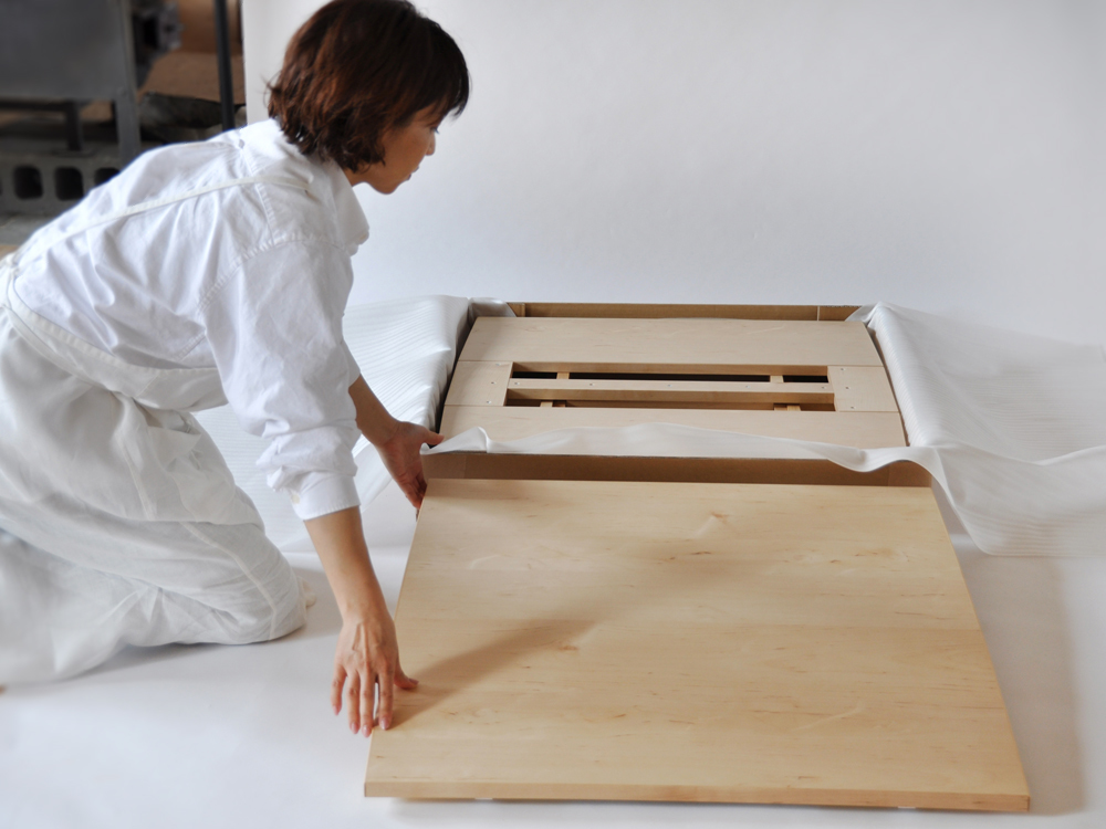 エクステンションテーブル組立て 01-テーブル本体(枠+天板+補助天板)と脚部は別梱包になっています。 01 02-脚を固定する、平ワッシャー、スプリングワッシャー、ナットが各8個と付属スパナ 02 03-メイン天板は乗せてあるだけです。横にずらします。 03 04-箱から出して、補助天板を少し上に持ち上げて外します。 04 05-完全に外して、横に置きます。 05 06-もう片方も外して、横に置きます。 06 07-テーブルの幕板(枠)を裏返します。(メイン天板を受ける板が下になるように) 07 08-脚を外側から付けます。ダボとボルトに合わせて入れます。角に脚がピッタリつくように。 08 09-ボルトに、平ワッシャー、スプリングワッシャー、ナットの順に入れ、指で回せなくなったら、上下ともスパナでしっかり締めます。工房オリジナルの隅木の形状がしっかりと脚を引きつけ、グラつきが出ません。 09 10-脚を4本固定したら、ひっくり返して、補助天板を差し込みます。 10 11-もう片方の補助天板も納めます。 11 12-メイン天板を乗せて、完成です。写真は、900のテーブルですが要領は、1300も同じです。。 12